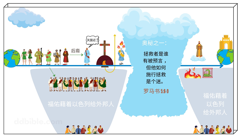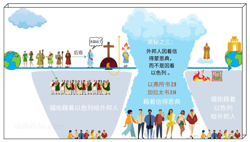 奥秘之四:在旧约和新约下,外邦人被称为“外人”,与以色列人隔离开,被神区别对待。但奥秘揭示后,以色列的特殊待遇被放置一旁,所有人都一样,都是罪人,都可以通过基督得救。
