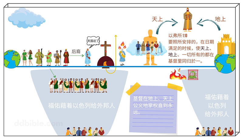 现在是奥秘发生的时候,得救的信徒应该期待他们在天上的永生位置。但并不代表,神对以色列的应许落空了。圣经说,神终究会安排天上、地上都在基督里同归于一。在那个时候,以色列会得到他们的应许之国,新天、新地、新约都会发生。耶稣是基督身体的头,也是以色列的王,天上和地上以祂为首的治理都是公义的。