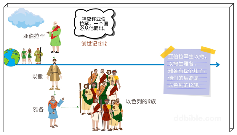 神选择了忠信的亚伯拉罕,应许他必有一个国从他而出,治理全地。亚伯拉罕百岁时得了儿子以撒,以撒生雅各,雅各生了12个儿子。神给雅各改名为“以色列”。以色列的12个儿子的后裔就是以色列国的12个族。