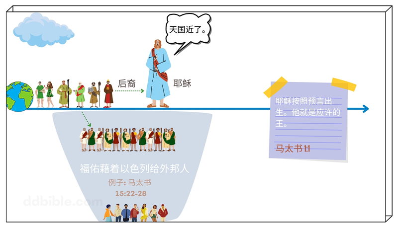 耶稣出生在大卫王的家族里。耶稣就是应许中的王。目前为止,神应许了以色列一块流着奶与蜜的地,数量如繁星般的子民,一个永恒的公义的王,再加上祂已给的律法——这些是建立一个国家的四项基本政治要素:地、人、领导和制度。这些要素备好了,神应许给以色列祖先的国度近在咫尺。所以马太、马可、路加、约翰四书里,耶稣说,天国近了。
